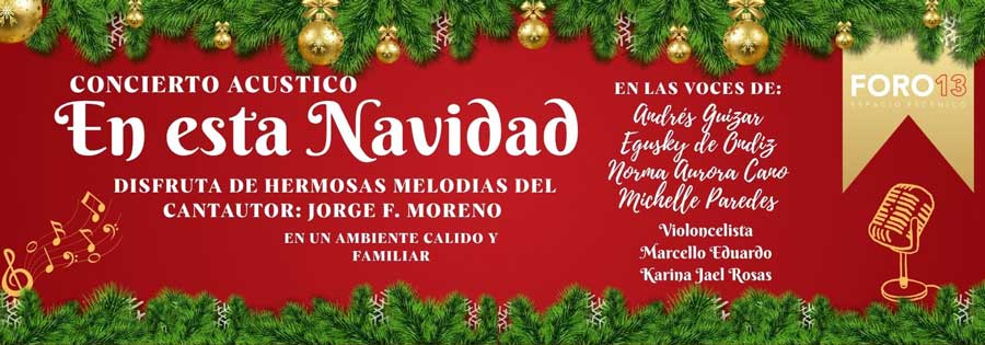 El concierto "EN ESTA NAVIDAD 2025" promete una noche mágica donde la música se convierte en un abrazo cálido, con música en vivo y canciones del compositor: Jorge F. Moreno, el concierto transporta a los asistentes a una época dorada de armonía y esperanza, acompañado de grandes artistas.